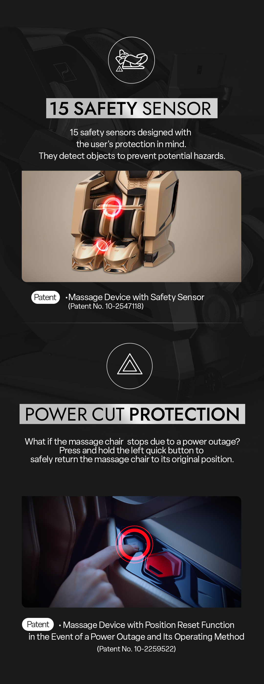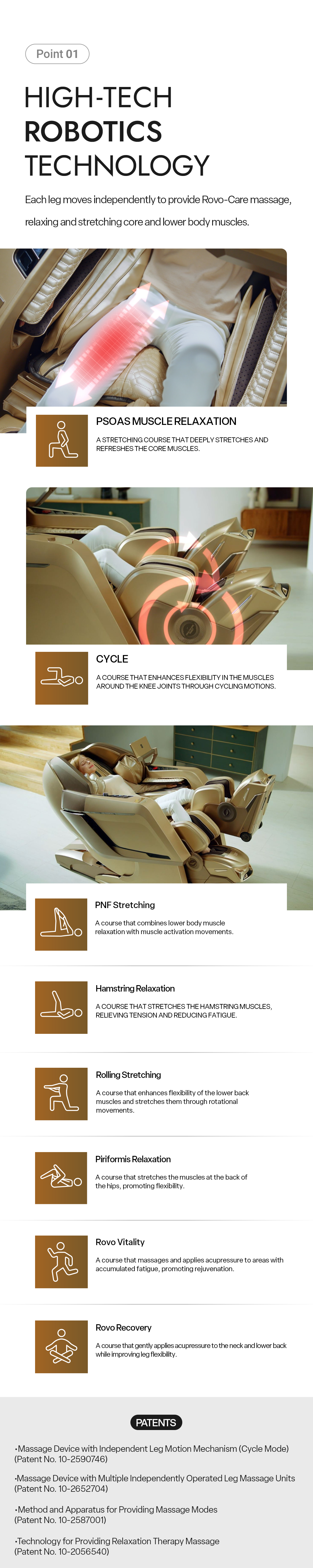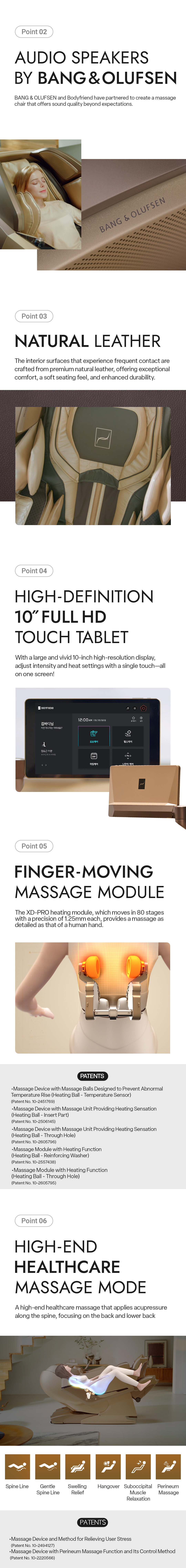 ROVO Technology enhances the massage experience on FALCON. Hip stretching is such a relief after a long day in front of a desk, and the acupressure pads target my hands, including my palms. I am surprised at how this massage chair reads my body shape and targets the muscles.