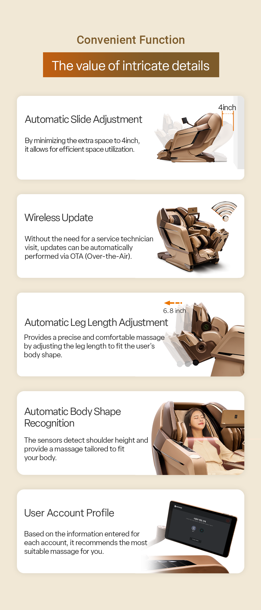 The Falcon massage chair from Bodyfriend is a game-changer! As someone who works long hours at a desk, I often suffer from back pain and stiffness. The Falcon's XD Massage and therapeutic stretch features are like having a personal masseuse at home. It's incredibly intuitive to use, and I love how I can customize my massage experience with its personalized profiles. After just a few sessions, I feel more relaxed and rejuvenated. Definitely worth the investment!